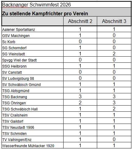 Am 24.07.2026 finden im Freibad in Backnang die 58. Schüler- und Stadtmeisterschaften statt. Hier erhalten Sie alle relevanten Informationen. Bei weiteren Fragen können Sie sich an schwimmfest@schwimmen.tsg-backnang.de wenden.