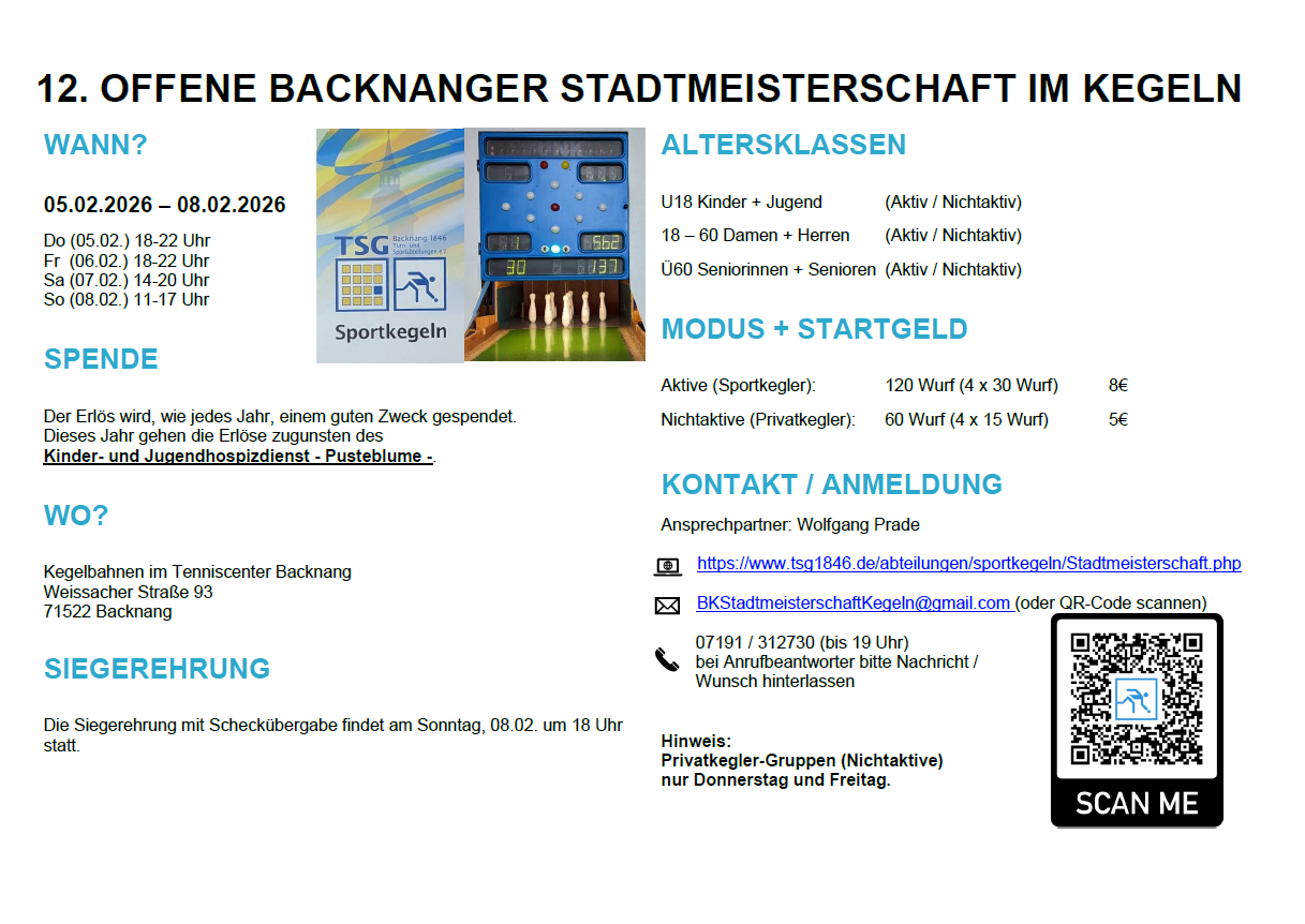 ArchivDetails der letzten Stadtmeisterschaften findet ihr hier:2023 - 9. offene Backnanger Stadtmeisterschaft im Kegeln2024 - 10. offene Backnanger Stadtmeisterschaft im Kegeln2025 - 11. offene Backnanger Stadtmeisterschaft im Kegeln