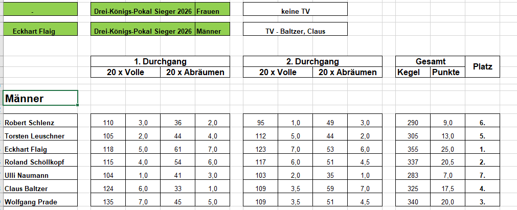Am 06.01.ging es wie in jedem Jahr um den 3-Königspokal. In 2 Durchgängen mit jeweils 20 Kugeln in die Vollen und 20 Kugeln Abräumen galt es, jeweils eine möglichst gute Platzierung zu erreichen, denn am Ende entschied nicht die Gesamtholzzahl sondern in erster Linie die anhand der Platzierung in den in den einzelnen Runden erreichte Punktzahl. In der ersten Runde konnten sich Wolfgang und Eckhart mit jeweils 12 Punkten etwas absetzen, Roland war mit 10 Punkten Dritter. Im zweiten Durchgang erreichte Eckhart fast die maximal mögliche Zahl von 14 Punkten und sicherte sich so mit insgesamt 25 Punkten mit großem Vorsprung den Sieg. Wolfgang dagegen schwächelte im zweiten Durchgang ein wenig und musste so noch Roland vorbeiziehen lassen. Gesamte Ergebnisse siehe unten.