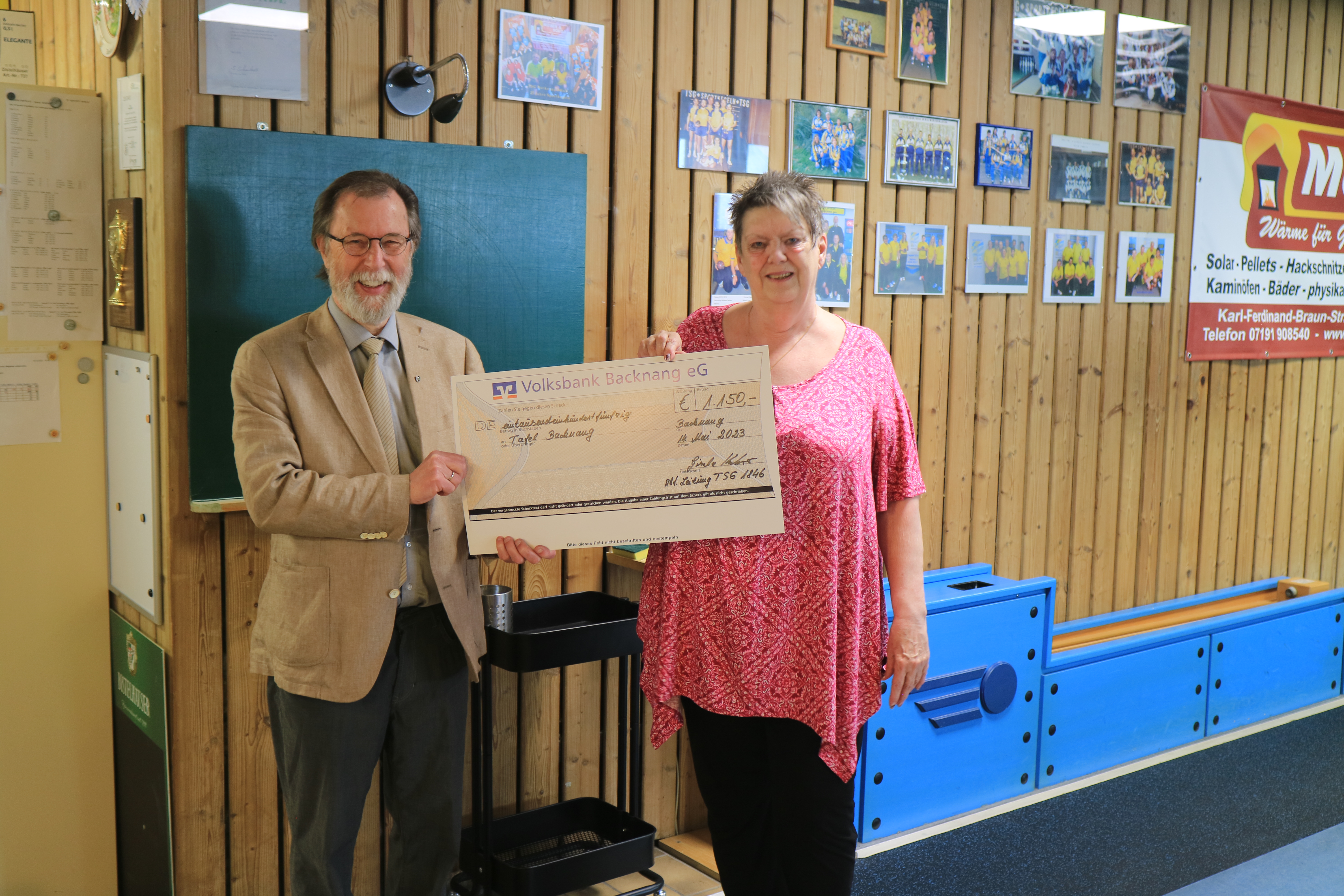Unsere Abteilungsleiterin Gisela Kehrer überreichte den Scheck in Höhe von 1150€ an Stadtrat Heinz Franke, welcher als Vertreter der Stadt Backnang und der Tafel Backnang vor Ort war.