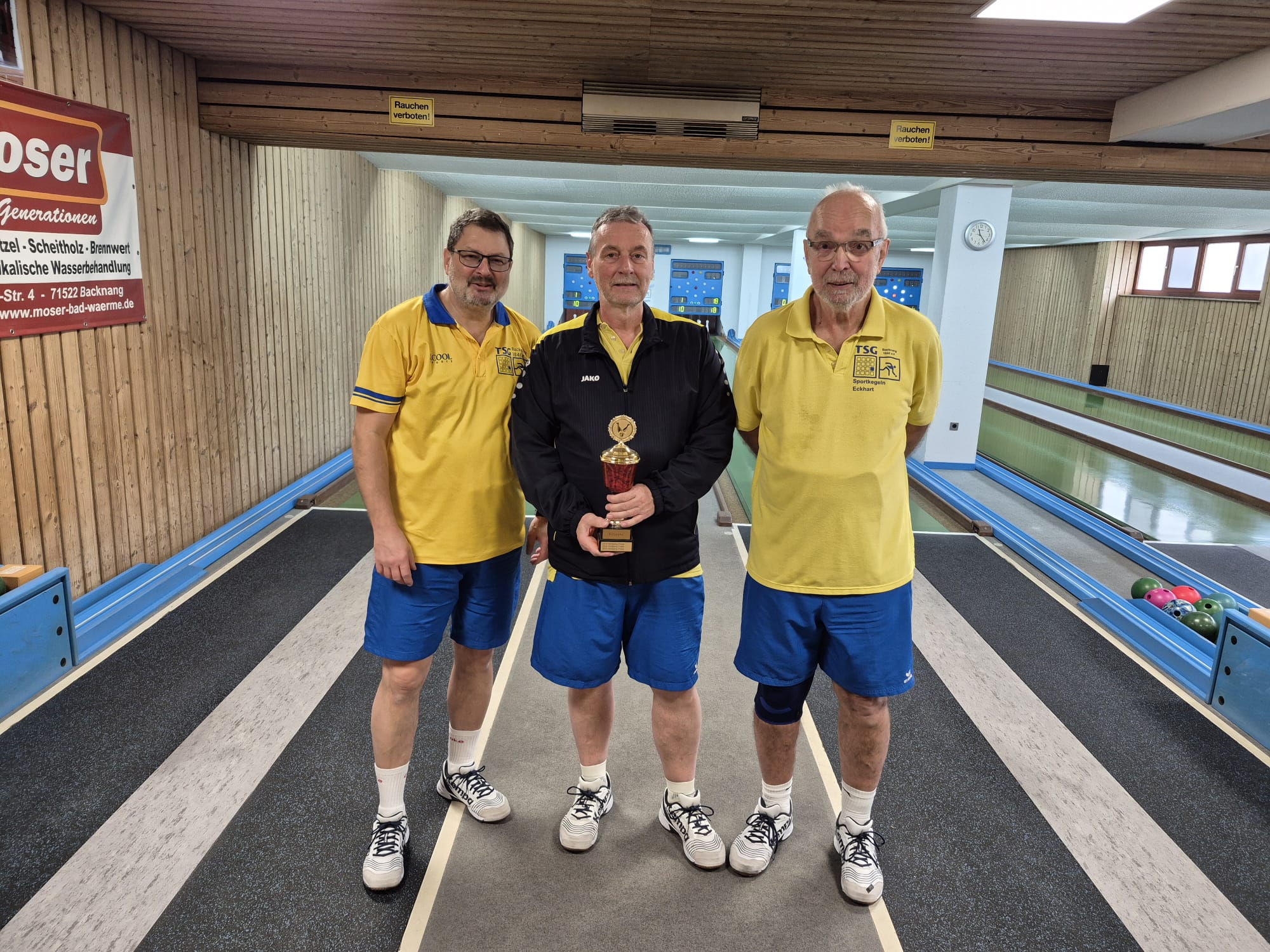 Im Finale mussten je 10 Wurf über alle 4 Bahnen die Abräumer entscheiden. Das wurde nochmal spannend. Nach dem Start ging Wolfgang (30) vor den anderen Dreien mit jeweils nur 22 Holz in Führung. In Runde 2 waren Eckhart (36) und Roland (35) sehr stark, während Wolfgang schwächelte (17). So führte jetzt Eckhart mit 58 Holz vor Roland (57) und Wolfgang (47). Gar nichts ging bei Robert – nur 8 Holz – damit war er aus dem Rennen. In Runde 3 war Wolfgang der Stärkste (36), nahm Eckhart 10 Holz ab und kam so bis auf 1 Holz an ihn heran. Roland kam nur auf 17 Holz und hatte mit nun 72 Holz schon 12 Holz Rückstand. Doch in der letzten Runde erreichte Roland äußerst starke 45 Holz und ließ Eckhart (17) und Wolfgang (18) keine Chance auf den Sieg. Mit 18 Holz Vorsprung setzte er sich vor den holzgleichen Eckhart und Wolfgang durch.