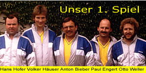 Unser 1. Match: Freundschaftsspiel beim FC Sonnenhof ging klar verloren. Ergebnis: 2239 : 1939. Einzelergebnisse: Anton Bieber 326, Otto Weller 305, Bernhard Böhr 308, Volker Häuser 311, Paul P. Engert 173, VP 144, Hans Hofer 372.